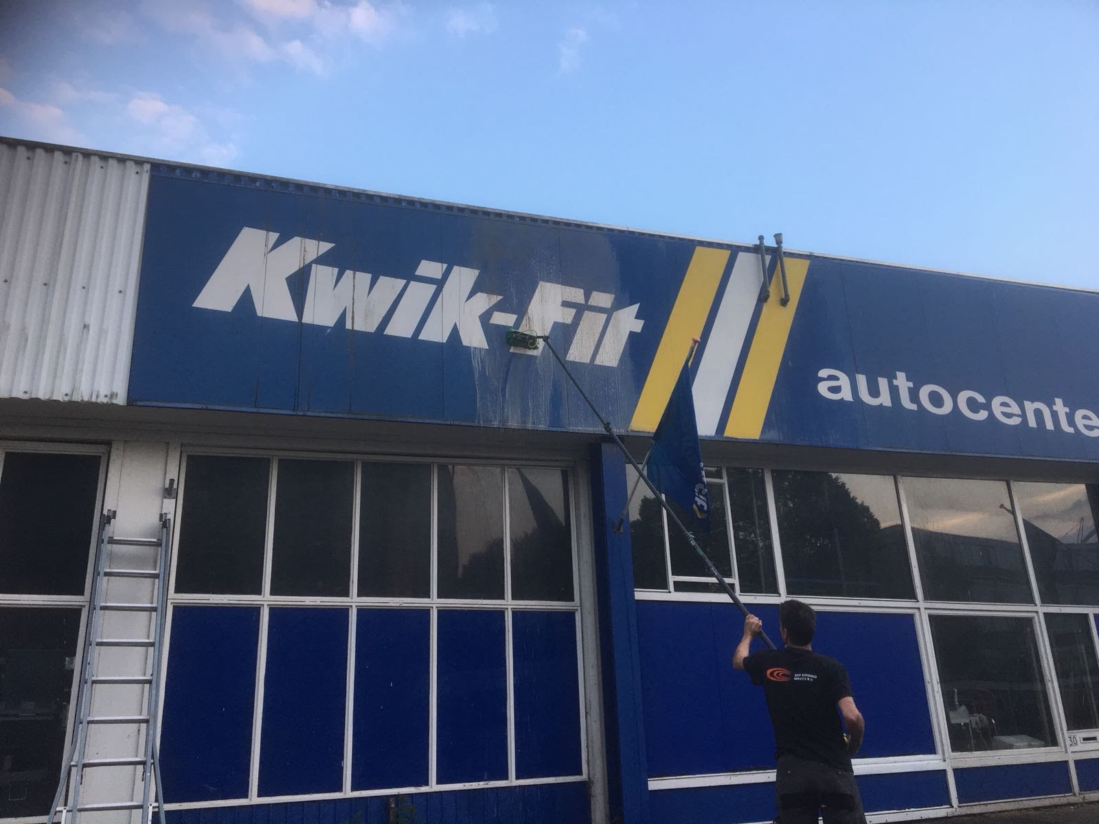 De gevel, het dak en de bestrating van een KwikFit zaak in Zwolle zaten onder de olie. Daarom zijn we meteen na melding van onze opdrachtgever PJ Milieu BV op pad gegaan om ergere olieschade te voorkomen.